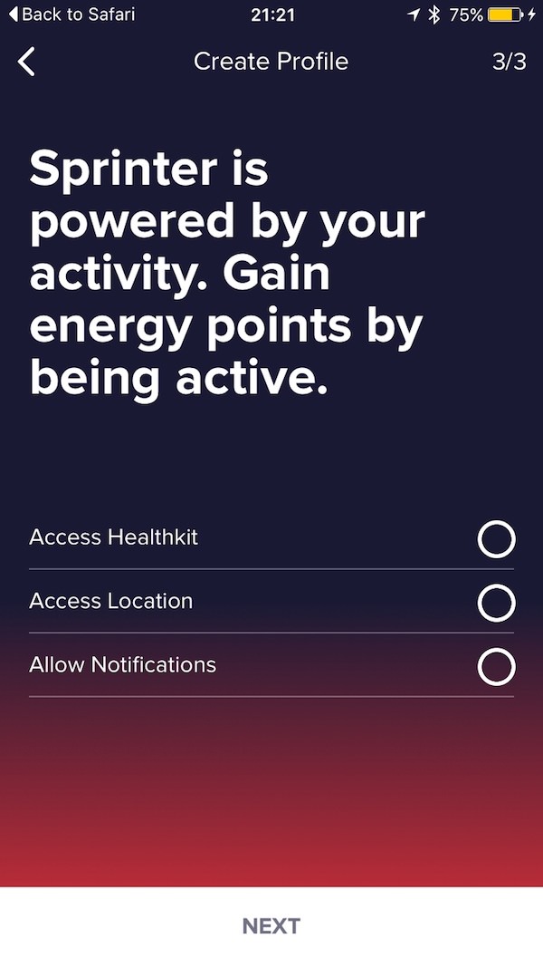 Sprinter immediately connects to the Apple Health Kit, which is an app summarising fitness results from all other apps on the user’s iPhone. Working out with an iPhone in the hand or pocket, Sprinter tracks the movement and saves fuel to the account. The fuel is needed to unlock key functionalities in the app, such as flicking through other users and instant messaging. With other words: the user needs to keep active to make the app running.