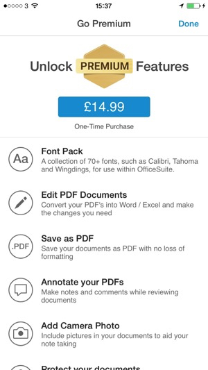 With MobiSystems Office Suite the onetime £14.99 purchase really does and useful new features along with the obvious getting rid of those adverts. Included is a boat load of fonts but no comic sans. That’s a bonus point right there!