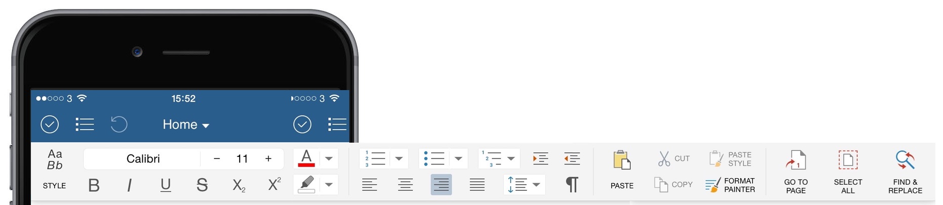For those not familiar with the ribbon bar concept you simply swipe across to show context related menu options. Set to “Home” as the default, most common formatting features here with other ribbon bars; insert, format, layout or view access with a tap on the “Home”.