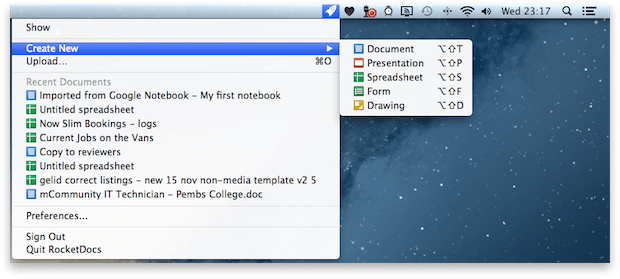 Also supported are Mac / Lion features built in/ drag and drop, inline editing, multi touch and full-screen mode. Nestled up within the Mac’s menu bar, RocketDocs waits for your prodding where you get a list of your most recently changed files.