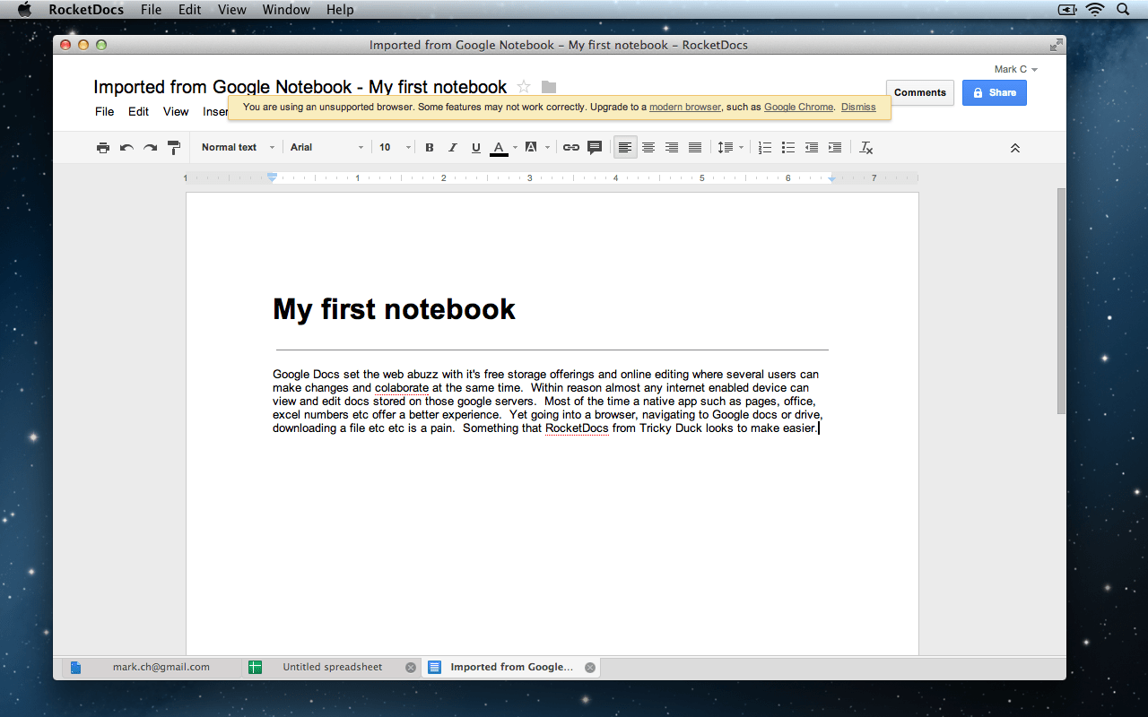 This might sound odd, dedicating yourself to making google docs into an app window that nestles down on the menu bar, why not just keep another browser window open? Well if you are anything like me it becomes all to easy to hammer cmd + w to close multiple windows, so at the very least Rocket Docs helps with that.