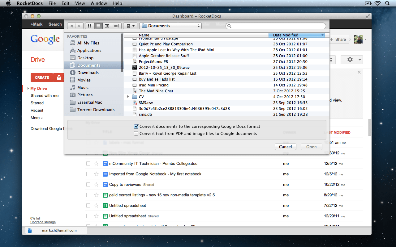 Just the other day in the office I was discussing how many keyboard OS shortcuts I bothered to learn for the Mac than back in my pc days. So it’s nice to see that a simple press of CMD + O lets you push a file up for either Google Docs or Drive. Again a small neat touch that’s nothing overly spectacular but another handy addition.
