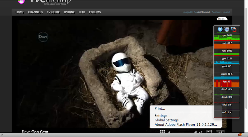Then, was watching a flash stream, I right clicked on the video to bring up the dialogue box and is you can see my CPU usage dropped from 61% to 37% in this one situation alone. Normally it’s maxing at 70 to 80 and it drops to below 40% with no frame rate or quality effect.