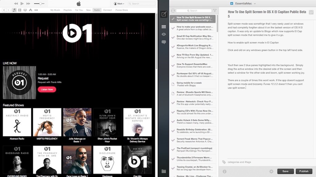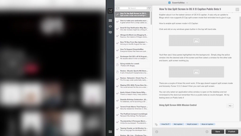 Split screen mode was something that I very rarely used on windows and had completely forgotten about it on the latest version of OS X El capitan. It was only an update to Blogo which now supports El Cap split screen mode that reminded me to give it a go.