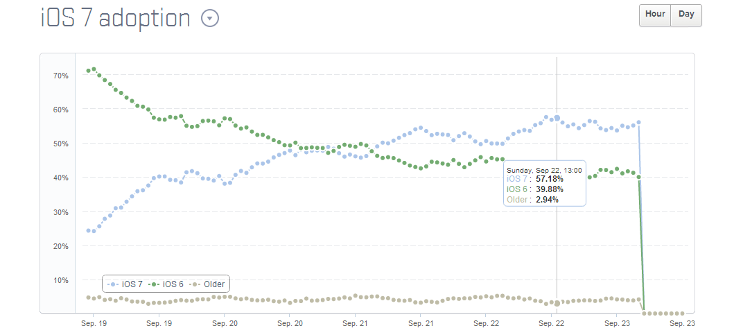 Well that was quick. It took a little over 4 days for iOS 7 to be installed on more devices than iOS 6. Check out the fantastic graph at mixpanel.com/