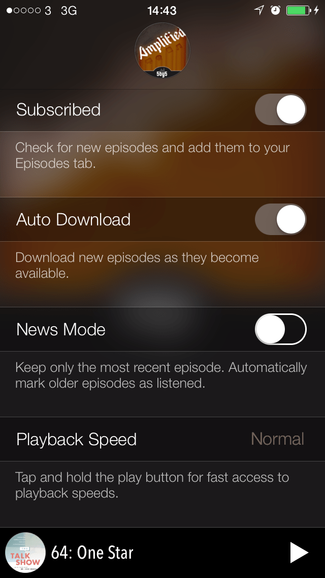 Settings are spares and done with a per stream basis rather than an overall application wide-set of choices. Due to my poorest of poor podcast management I have 700+ casts to catch up. News mode there to help with just that although I’m not entirely sure how many old casts it will keep.
