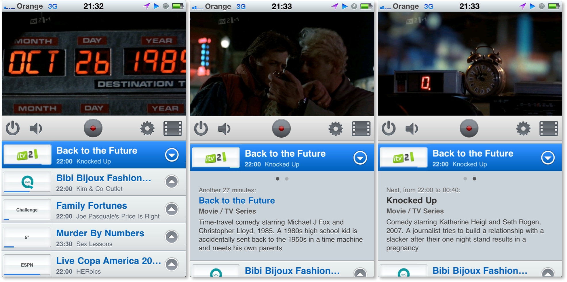 Rotating the iPhone to its horizontal position takes you into a full screen mode, the only thing you can do here is double tap the screen to zoom in, handy for broadcasts shown in non-widescreen format or for general zooming in on something. This does mean that if you want to record what you’re watching it’s a question of rotating the iPhone back to the vertical position. It does seem a touch bonkers that there is no way to record from the horizontal position, but it’s more a niggle than a drawback.