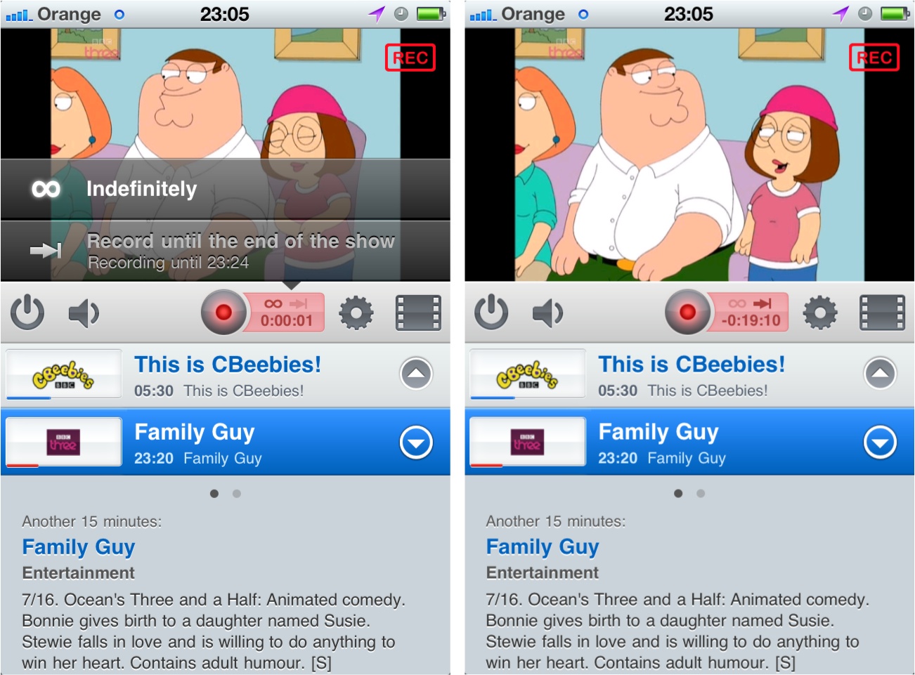 With the phone in its vertical position you can record a new program by pressing the record button, this will give you two options. Option one is to record indefinitely to the size of the available free space on your device, option two let’s you just record that program. Safety margins can be automatically applied so that recordings start and finish with some padding either side, to allow for timings and programs over running (Normally when Top Gear is on)