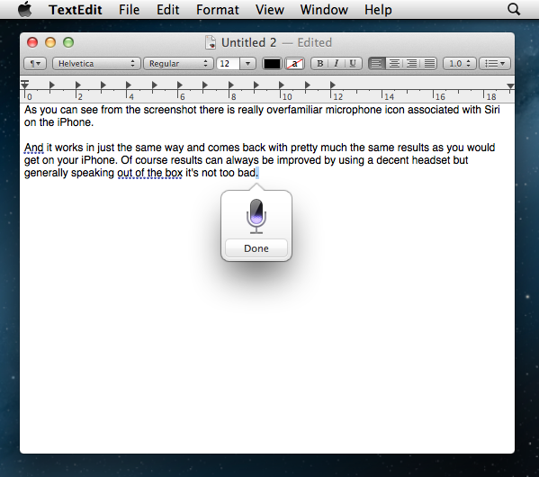 So to start, double tap the FN key (or whatever you’ve designated), wait for the double beep and start talking, when done hit FN, wait a few moments and the results magically appear on screen. Unlike the iPhone implementation, Mountain lions dictation speech doesn’t automatically recognise when you finish speaking yet it does eventually time out when it’s not heard anything.
