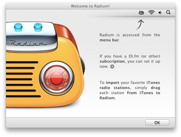 As you can see from the first running of the application you get a nice little intro box telling you the basics of how to use Radium.  Clicking okay dismisses the box and leaves you with a nice icon in the menubar.